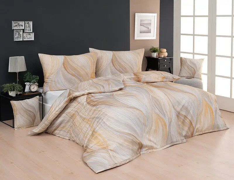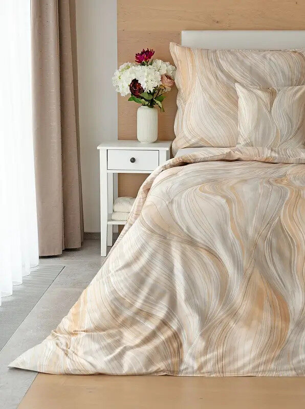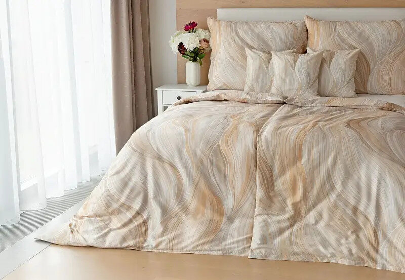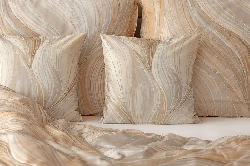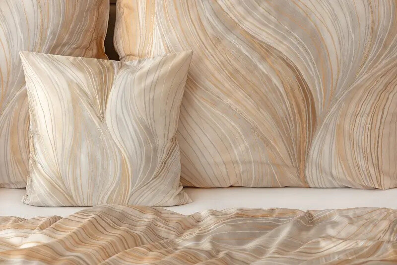 Souhra hřejivých odstínů béžové a hnědé protnutá paletou šedých tónů skvěle vynikne díky hebkému bavlněnému saténu, který dodává povrchu jemný lesk.